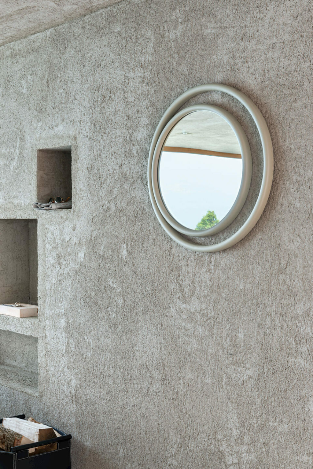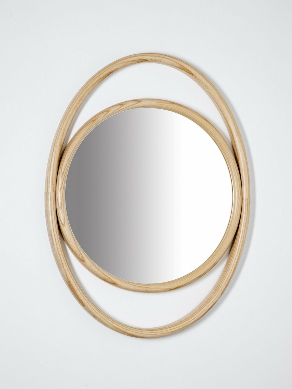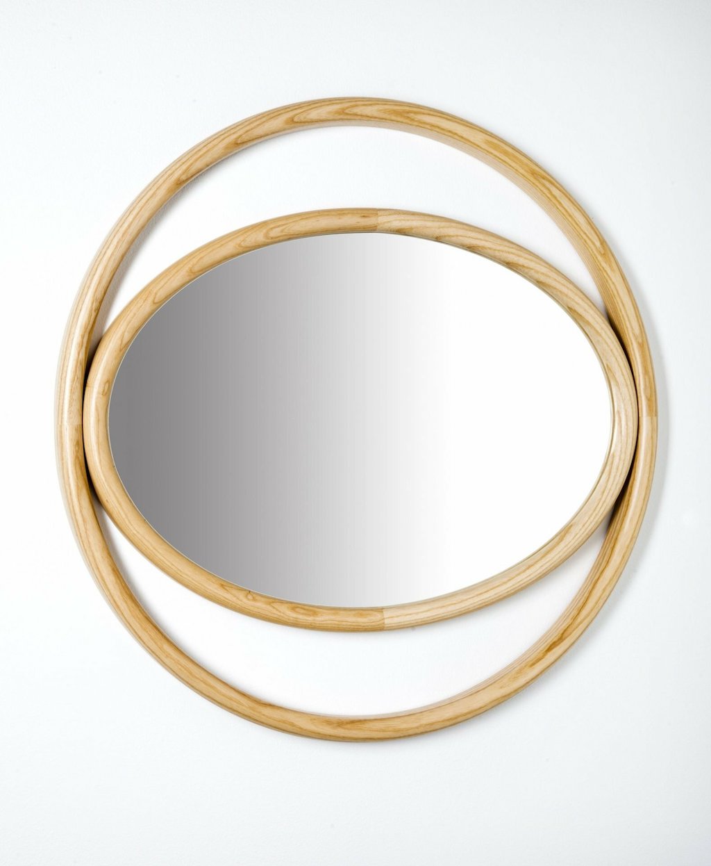 Das dampfgebogene Eschenholz umschließt, in verschiedene Größen abgewandelt, die reflektierende Oberfläche und verstärkt die forschende Resonanz des Auges.