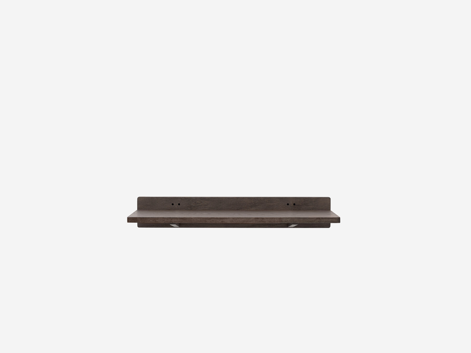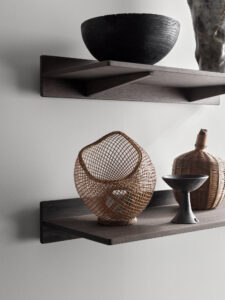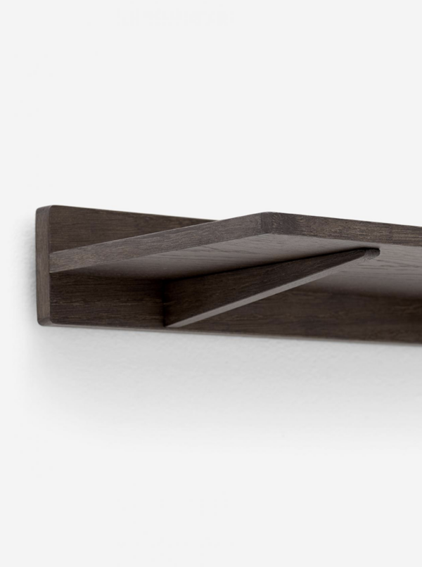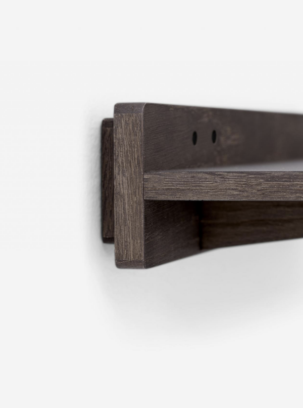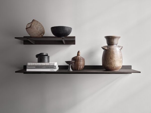 Vipp setzt seinen Ausflug in die Wälder mit einem Duo aus dunklen Eichenregalen fort. Erhältlich in 60 und 120 cm Länge, haben die beiden Regale die gleiche Tiefe und können in unzähligen, individuellen Kompositionen kombiniert werden. Die Regalplatte ist auf einer schmalen, vertikalen Eichenplatte montiert und wird von zwei diskreten Regalhaltern getragen.