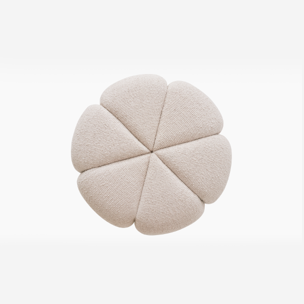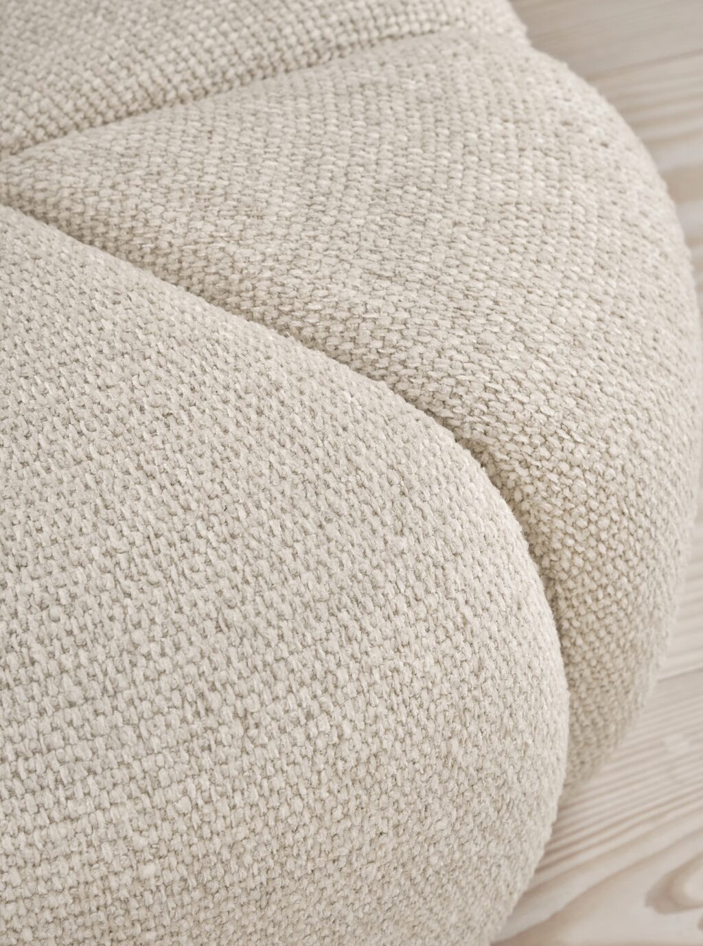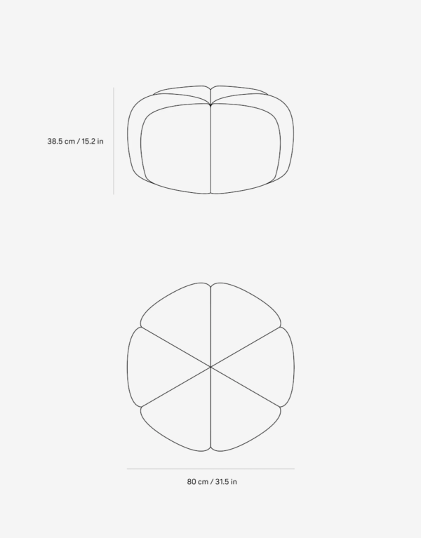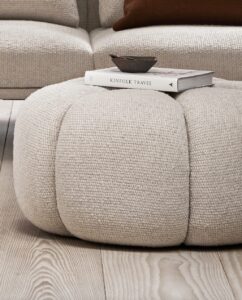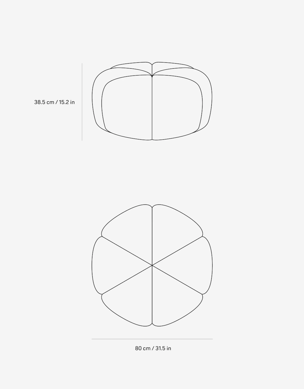 Der sechseckige Pouf ist skulptural und doch informell, mit linearen Details und runden Kanten. Der Hocker besteht aus hochelastischem Schaumstoff, der um einen Holzrahmen geformt ist. Er ist vielseitig einsetzbar und behält seine feste Form über viele Jahre.