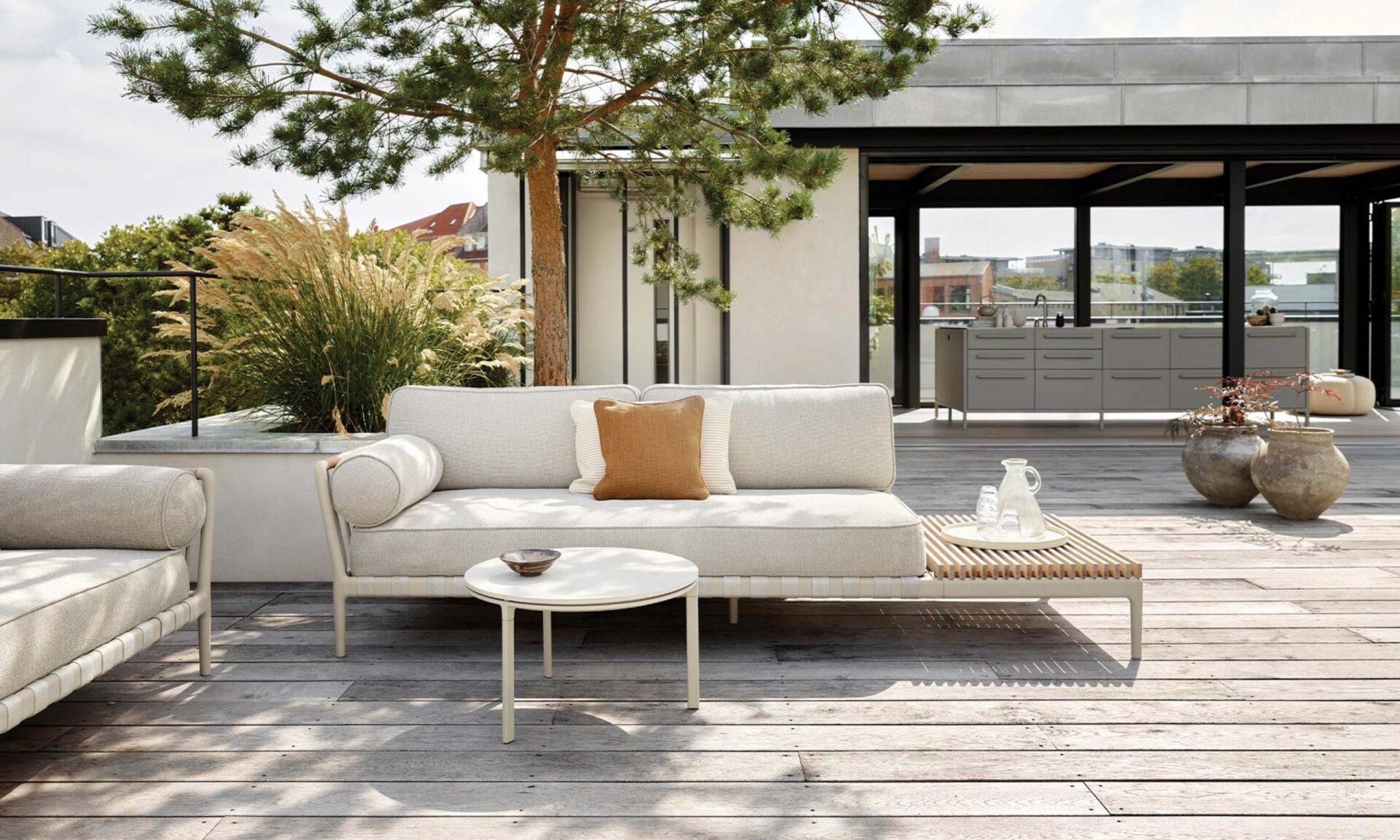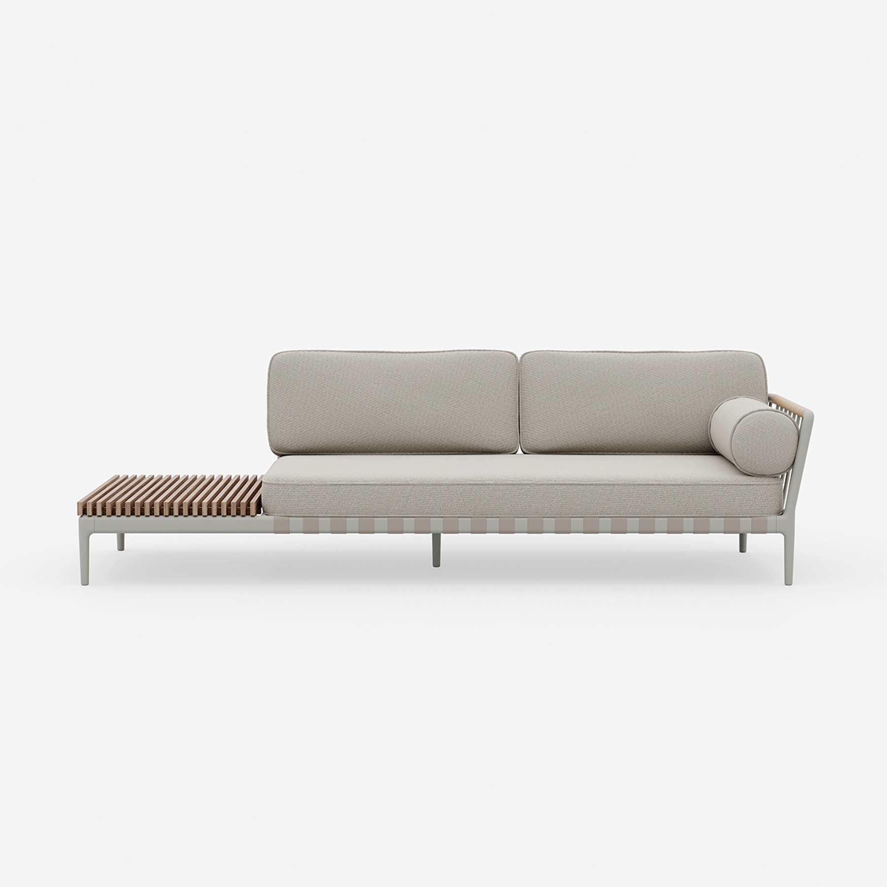 Das Open-Air Sofa mit Tischende ist sowohl mit einem links- als auch rechtsorientierten offenen Ende mit integriertem Beistelltisch aus Teakholz-Lamellen erhältlich.