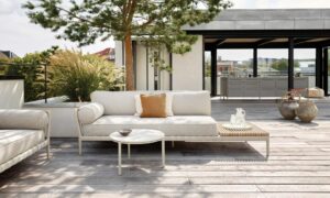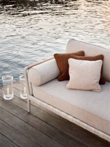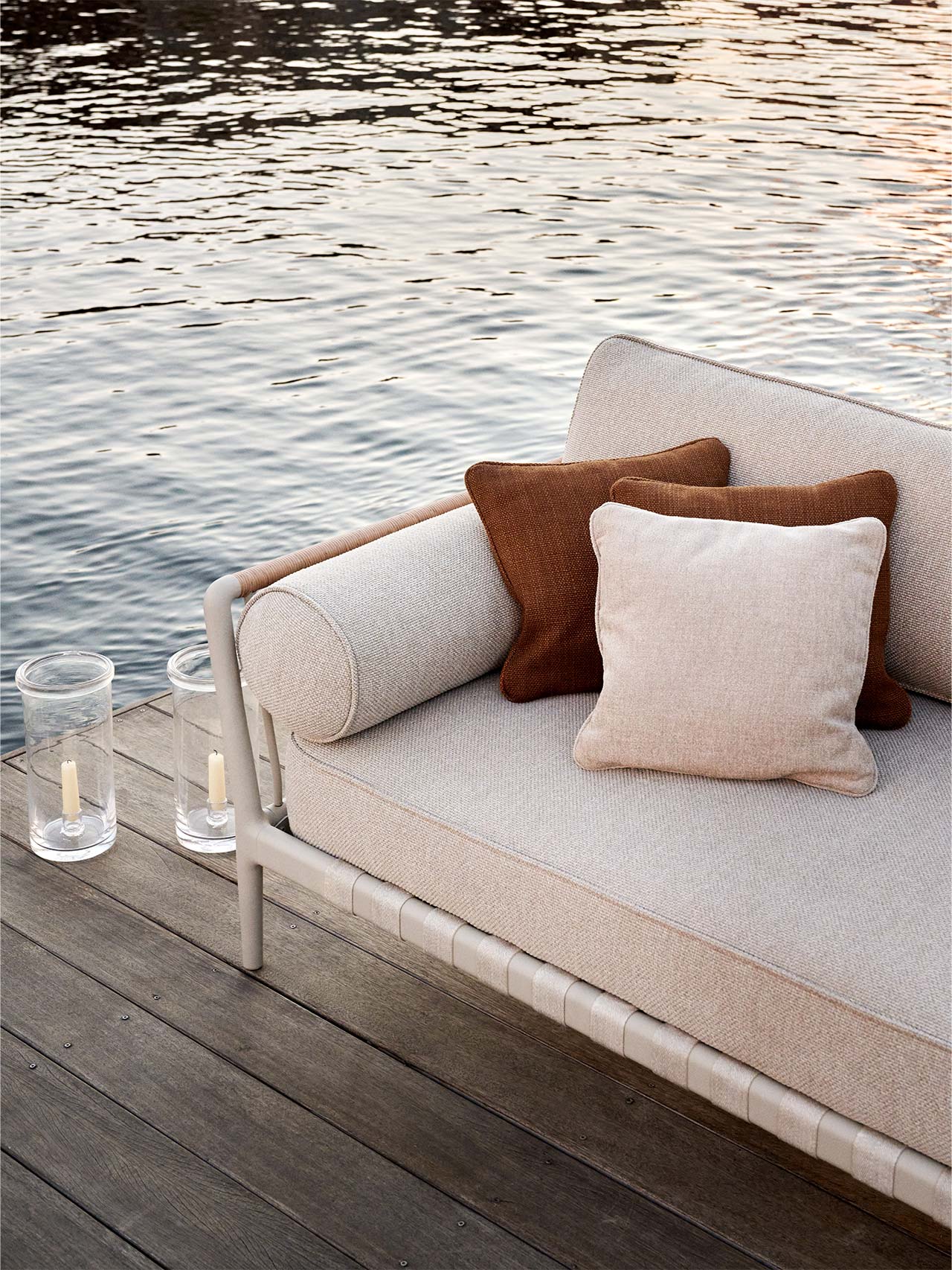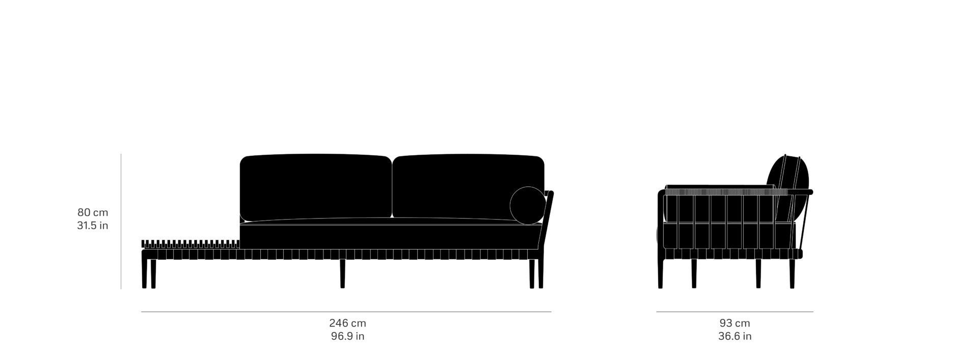 Das Gestell des Sofas ist aus Aluminium gefertigt und widersteht den Bedingungen im Freien, indem es Rost und Verfärbungen verhindert. Ein speziell entwickeltes System von Riemen ist unter den Sitzpolstern angebracht, um den Komfort zu erhöhen. Die Gurte sind sichtbar und greifen das rhythmische Muster der Rücken- und Armlehne auf. Die Kissen der Rückenlehne und der Nackenrolle bestehen aus einer Mischung aus Fasern und Schaumstoff, die schnell trocknen können.