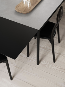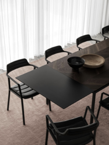 Die matt lackierte Oberfläche schützt die Platte vor der täglichen Abnutzung. Die Form der Verlängerungsplatte spiegelt das Design der Tische Vipp971-972 wider, was dazu einlädt, die Platte auch dann noch zu benutzen, wenn die Gäste schon gegangen sind